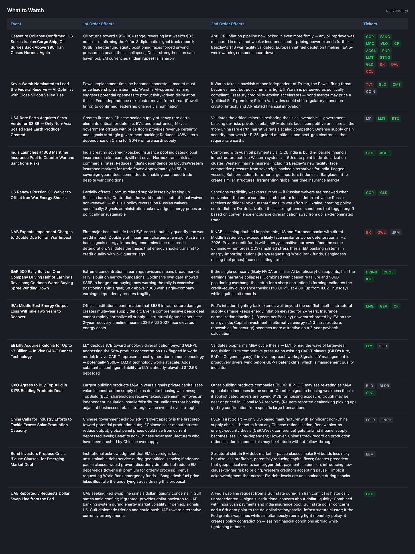 Two genuinely new developments demand attention: Kevin Warsh’s nomination to replace Powell at the Fed (adding a fourth dimension to the Treasury credibility erosion thesis), and the IEA’s official confirmation that Middle East energy output will take two years to recover regardless of diplomatic outcomes. Both operate on timelines far longer than any ceasefire window.