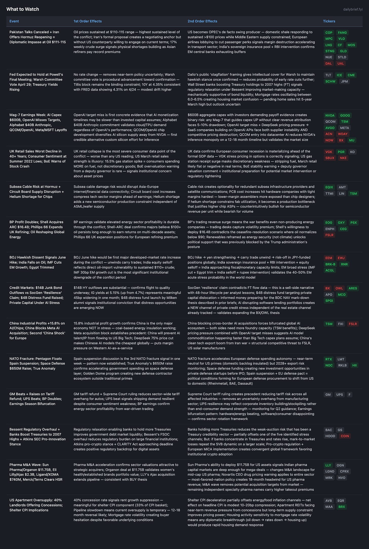 Fed policy: Hold expected. Likely Powell’s last meeting. Warsh committee vote April 29 — procedural, not confirmation. Tillis block persists. Rates at 3.64%.
