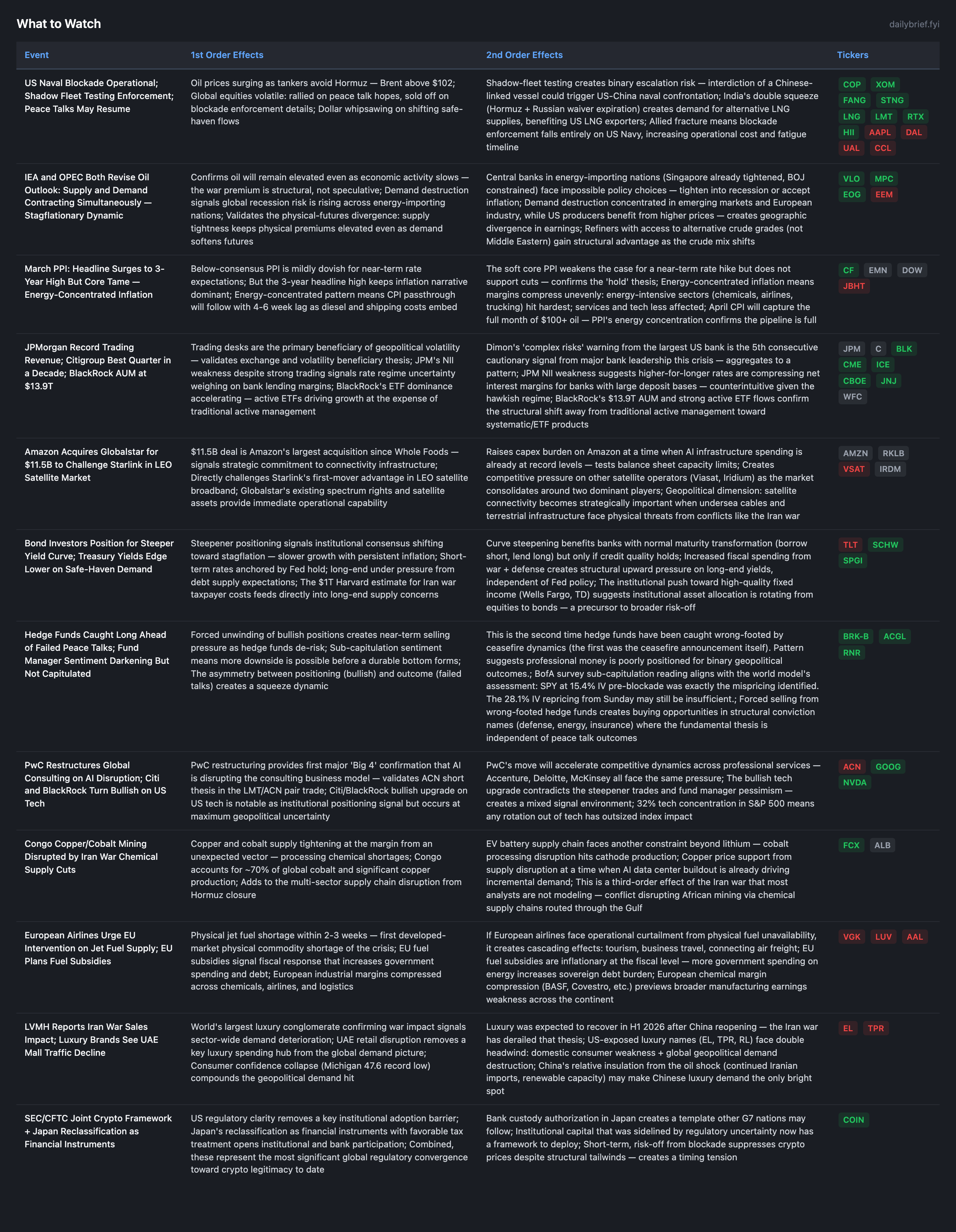 The key new data today: (1) March PPI rose 0.5% vs 1.1% consensus — energy-concentrated, core tame — providing modest near-term dovish signal while confirming the inflation pipeline is full; (2) JPMorgan, Citigroup, and BlackRock reported strong Q1 earnings driven by trading volatility, with Dimon issuing his most explicit warning yet about economic complexity; (3) Amazon’s $11.5B Globalstar acquisition reshapes the satellite connectivity market; (4) Congo copper/cobalt mining disrupted by Iran war chemical supply cuts — a third-order supply chain effect; (5) European airlines formally requesting EU intervention on jet fuel supply, confirming the 2-3 week shortage timeline.
