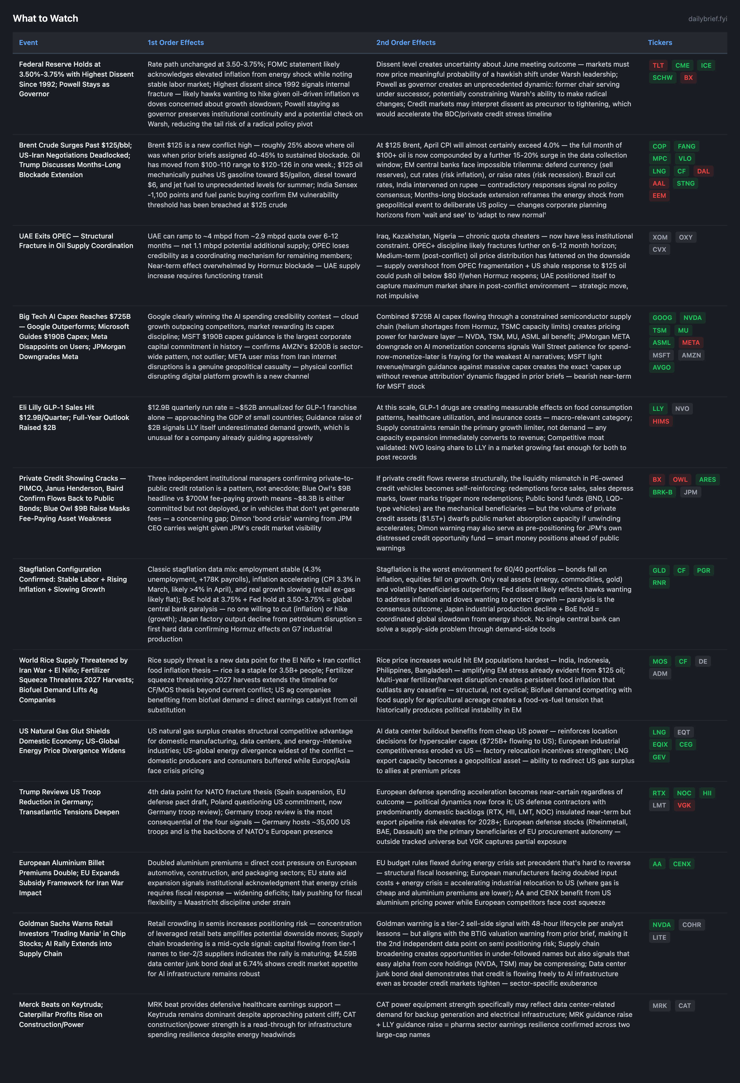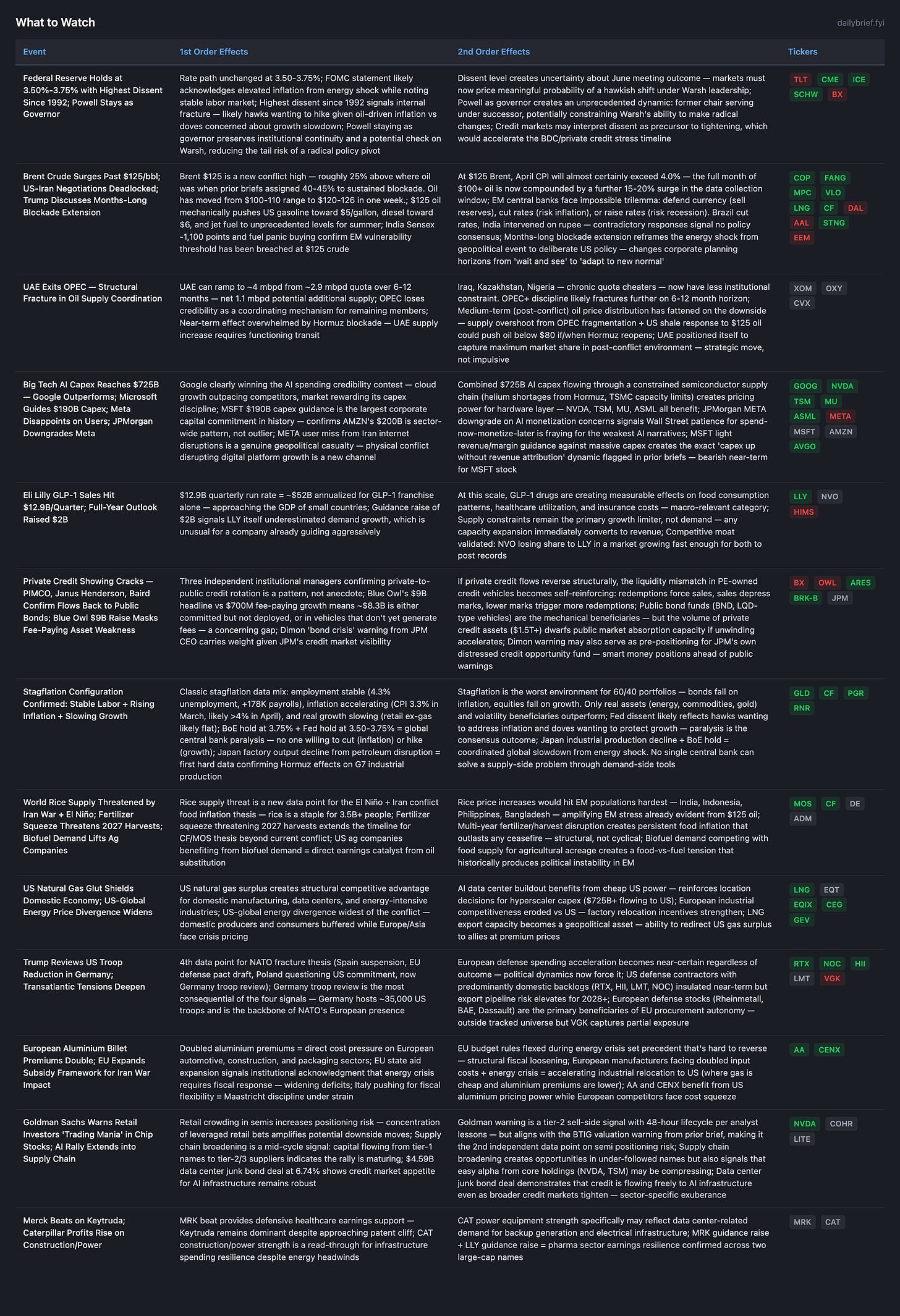 Three material shifts since yesterday’s brief. First, Brent crude breached $125/bbl on confirmed US-Iran negotiation deadlock AND Trump explicitly discussing a months-long blockade extension with oil executives. This converts the energy shock from geopolitical uncertainty to deliberate US policy, changing corporate planning horizons. Second, the Fed held with the highest dissent since 1992. Powell’s decision to stay as governor creates an unprecedented dynamic: former chair serving under Warsh, constraining radical policy shifts but signaling institutional concern about the direction of travel. Third, Big Tech earnings revealed a $725B aggregate AI capex commitment, with Google winning the spending-credibility contest while Meta was downgraded by JPMorgan and Microsoft guided $190B capex against light revenue.