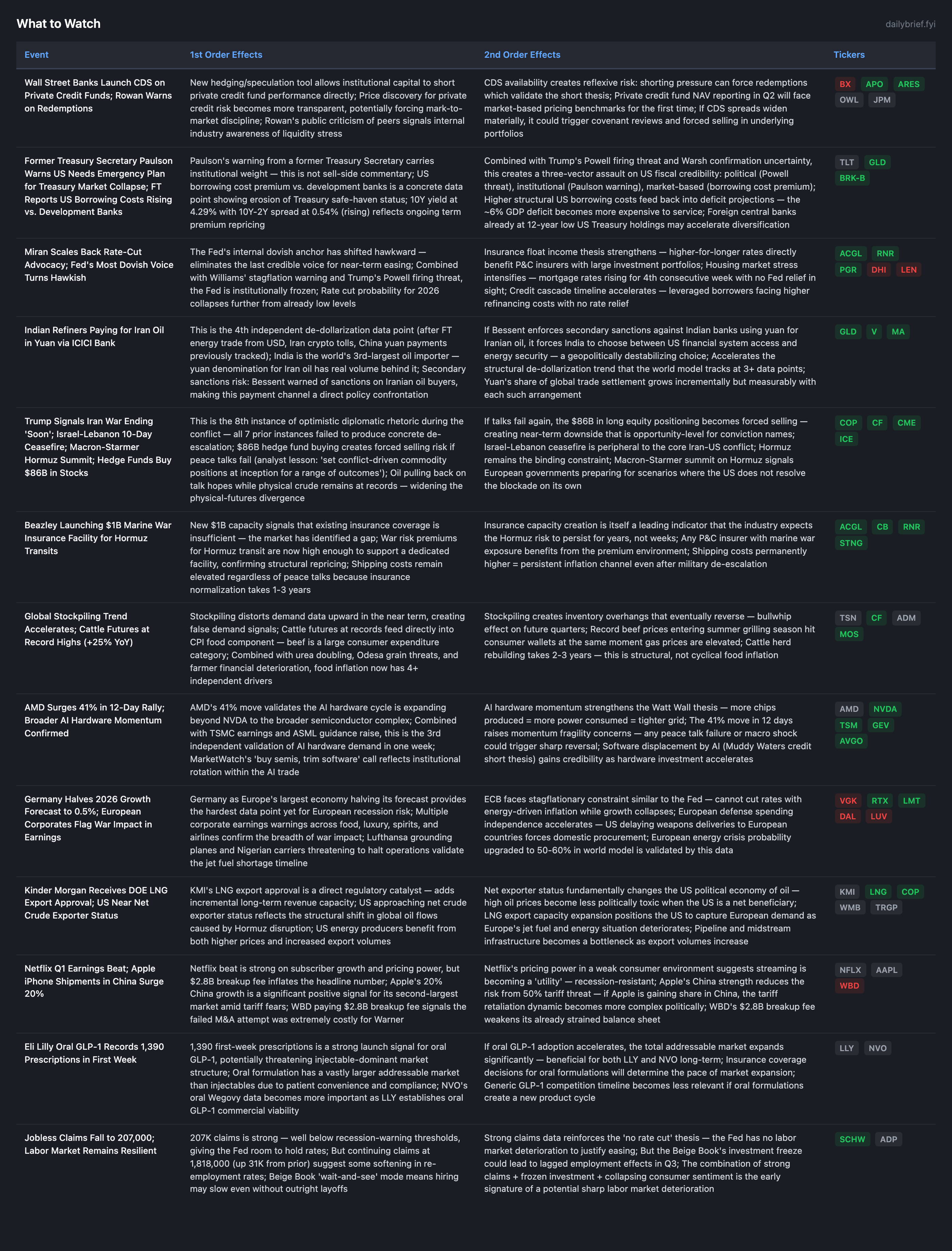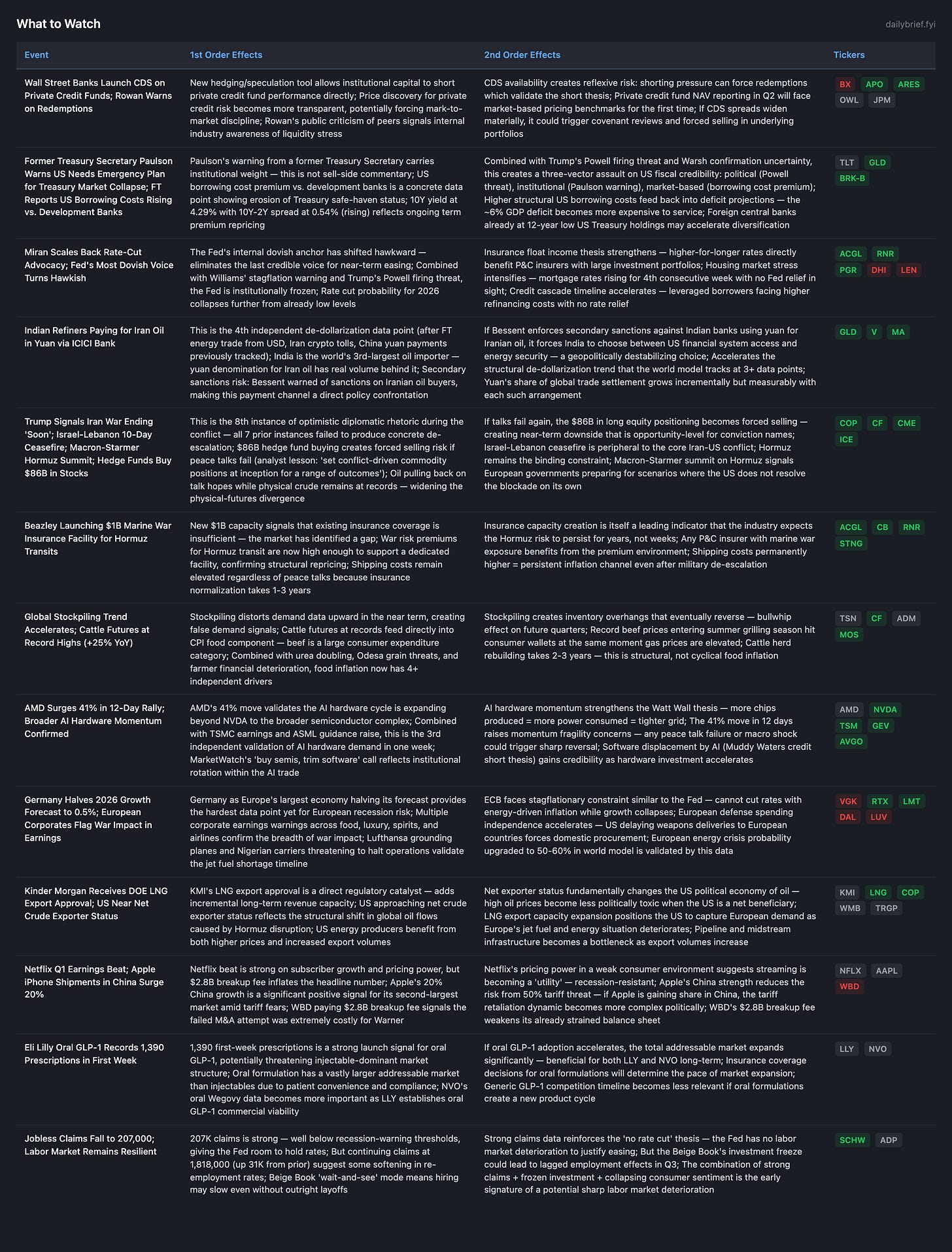 The primary shift since yesterday’s brief: the diplomatic track has moved from stalled to tentatively active. Trump signaled the Iran war “should be ending pretty soon,” a 10-day Israel-Lebanon ceasefire was confirmed, and a Macron-Starmer summit on Hormuz security was announced. Goldman data shows $86B in hedge fund stock buying on peace hopes. Oil pulled back on these signals. However, three structural developments argue the equity market’s all-time high remains fragile: (1) Wall Street banks have launched credit default swaps on private credit funds managed by Apollo, Ares, and Blackstone — the first market-based instrument for shorting private credit directly; (2) former Treasury Secretary Paulson called for an emergency plan for Treasury market collapse, while the FT reports the US is losing its lowest-cost-dollar-borrower status; (3) Fed Governor Miran, previously the most aggressive rate-cut advocate, scaled back his dovish stance, eliminating the last internal voice for easing. The credit-equity divergence identified in prior briefs persists: HYG OI P/C at 4.82 (up from 4.78 yesterday), international markets in backwardation, while SPY sits at 12.8% IV in flat term structure.