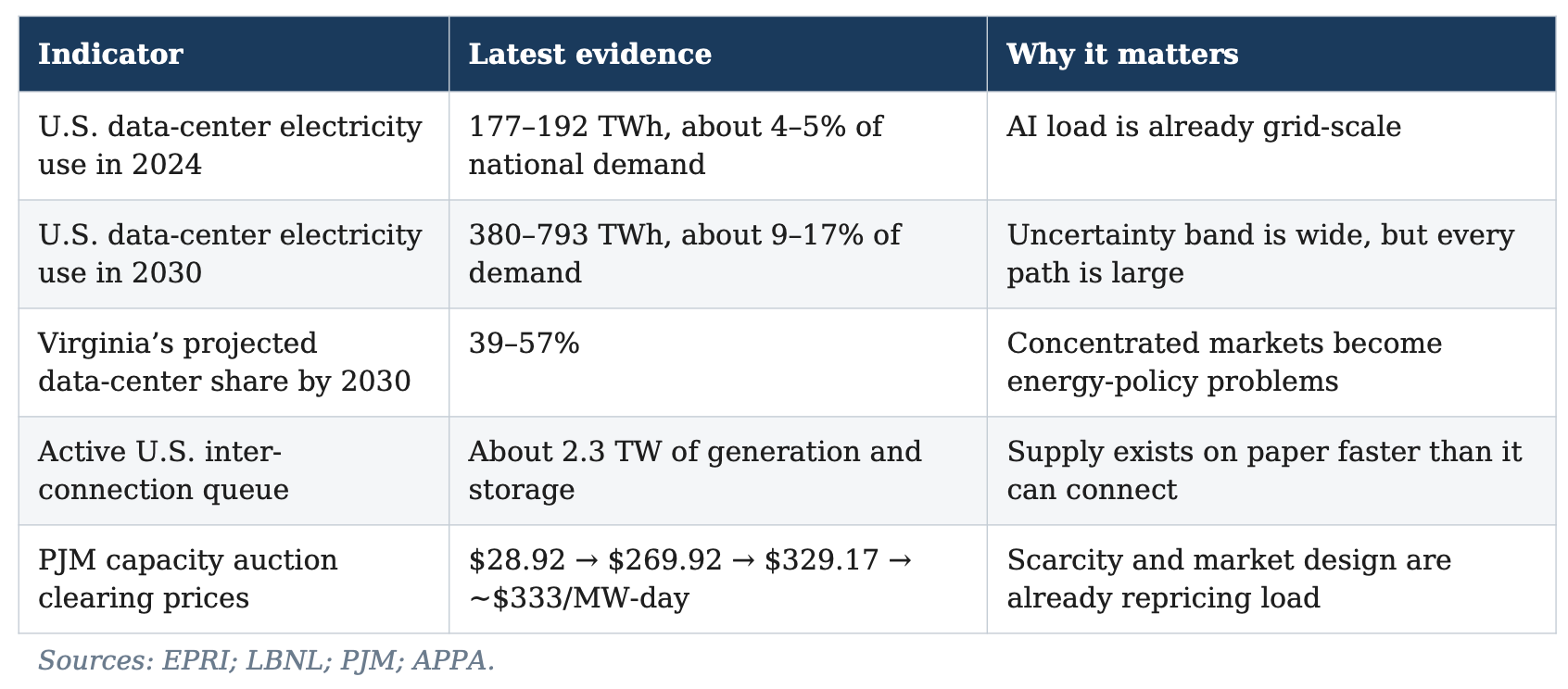 [^15]: PJM auction reports for the 2024–25, 2025–26, and 2026–27 Base Residual Auctions; American Public Power Association summary of the 2027–28 auction.