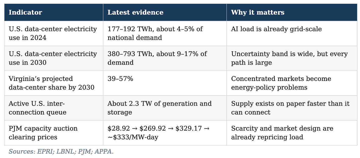 Virginia is the clearest preview. EPRI estimates that data centers already account for about a quarter of in-state electricity use there and could reach 39–57% by 2030, with seven more states crossing the 20% threshold.[^5] Once a single industry reaches that scale, it stops behaving like an ordinary customer segment. Its siting choices, outage risks, and tariff disputes become de facto energy policy.