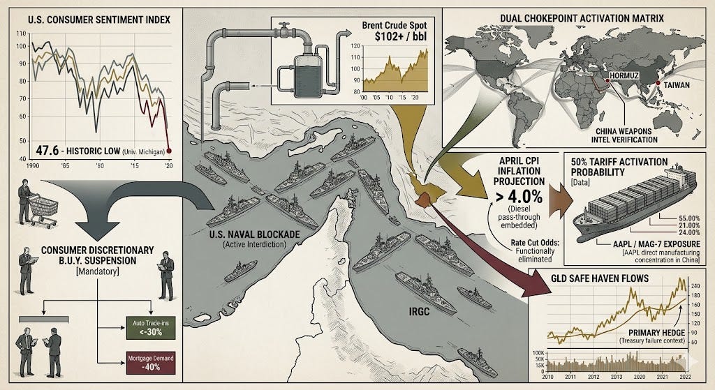 Three genuinely new developments require analysis: (1) the blockade itself, which is qualitatively different from the prior crypto-toll standoff; (2) the China-Iran weapons intelligence triggering a 50% tariff threat, linking the Iran conflict directly to the US-China trade relationship; and (3) consumer sentiment hitting a record low of 47.6, the worst reading in the survey’s multi-decade history.
